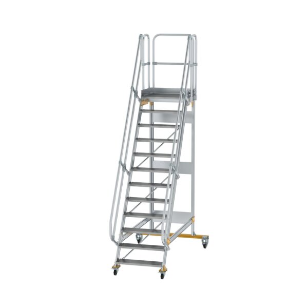 Fahrbare MUNK Plattformtreppe, 60° Neigung, 800 mm Stufenbreite, 12 Stufen, Plattformlänge 460 mm. Aus Aluminium, mit beidseitigem Handlauf und 3-seitigem Geländer. Zwei Lenkrollen und zwei Bockrollen für Mobilisierung, inkl. Feststeller für Sicherheit. Max. Belastung 300 kg. Optional Edelstahlteile für Außeneinsatz.