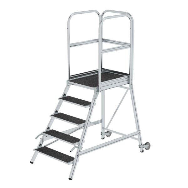 MUNK Podesttreppe aus Aluminium, einseitig begehbar, mit Rollen und Griffen, 5 Stufen, rutschfeste Korrundbeschichtung R13. Plattform: 600x800 mm, mit 3-seitigem Geländer, Traglast bis 150 kg. Ideal für sicheres Arbeiten in Werkstätten.