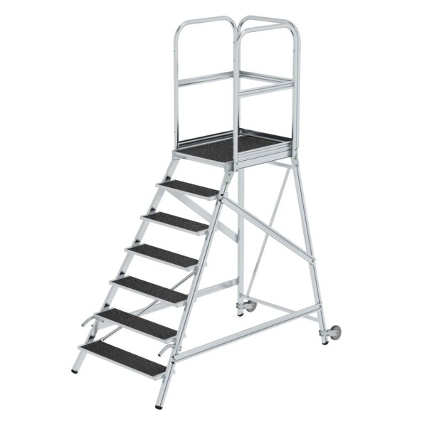 MUNK Podesttreppe, einseitig begehbar, aus Aluminium mit Rollen und Griffen. 7 Stufen, rutschfeste Korrundbeschichtung R13, stabiles Geländer, Plattform 600x800 mm. Belastbar bis 150 kg. Ideal für Industrie und Lager, entspricht DIN EN 131-7.
