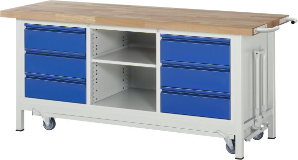 RAU Werkbank 8581I2 mit Fahrgestell, B2000xT700xH880mm, ausgestattet mit einer 40 mm dicken Buchen-Massivholzplatte und einem robusten Vierkantrohr-Gestell. Inklusive 6 Schubladen auf rollengelagerten Schienen, offenem Fach mit verstellbarem Boden und einer Flächenlast von bis zu 1.250 kg. Komplett montiert geliefert, 5 Jahre Qualitätsgarantie, Made in Germany.