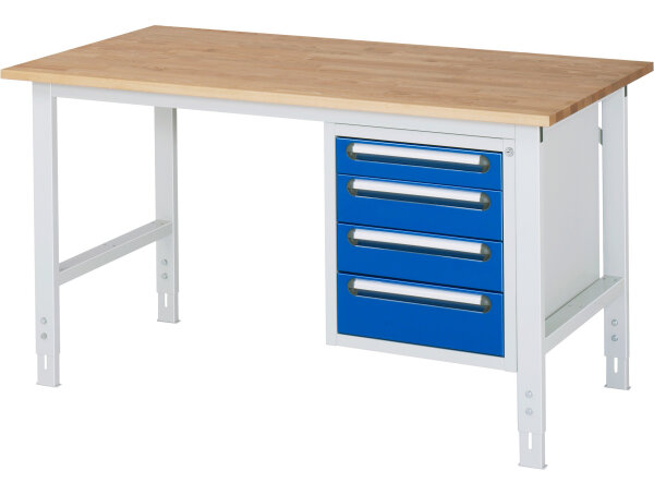 Der RAU Arbeitstisch Tom KM07 bietet eine höhenverstellbare Massivholz-Arbeitsplatte aus Buche (1500x800 mm, 25 mm stark), umstellbar zwischen 760-1080 mm. Inklusive robustem Metallgestell und 4 Schubladen. Flächenlast bis 500 kg. Einfache Montage, 5 Jahre Qualitätsgarantie. Made in Germany.