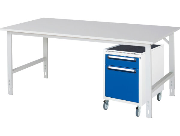 Höhenverstellbarer RAU Arbeitstisch Tom KM08, 200x100 cm, mit melaminharzbeschichteter Platte (22 mm), inklusive Rollcontainer mit 3 Schubladen. Robustes Stahlgestell, Traglast bis 500 kg. Einfache Montage, 5 Jahre Garantie. Made in Germany.