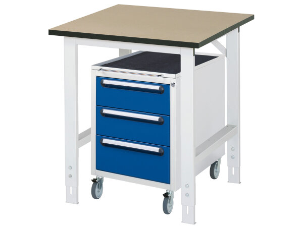 Höhenverstellbarer RAU Arbeitstisch Tom KM09, Maße: B750xT800xH760-1080mm, mit widerstandsfähiger 22mm MDF-Platte. Inklusive Rollcontainer mit 3 Schubladen und einer max. Flächenlast von 500 kg. Einfache Montage, 5 Jahre Qualitätsgarantie, Made in Germany.